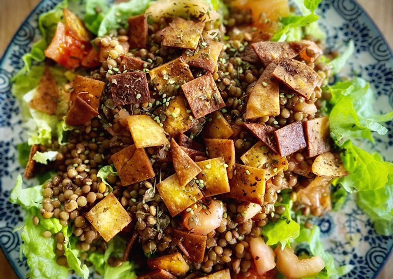 Ensalada templada de lentejas beluga con chips aromatizados de tortilla