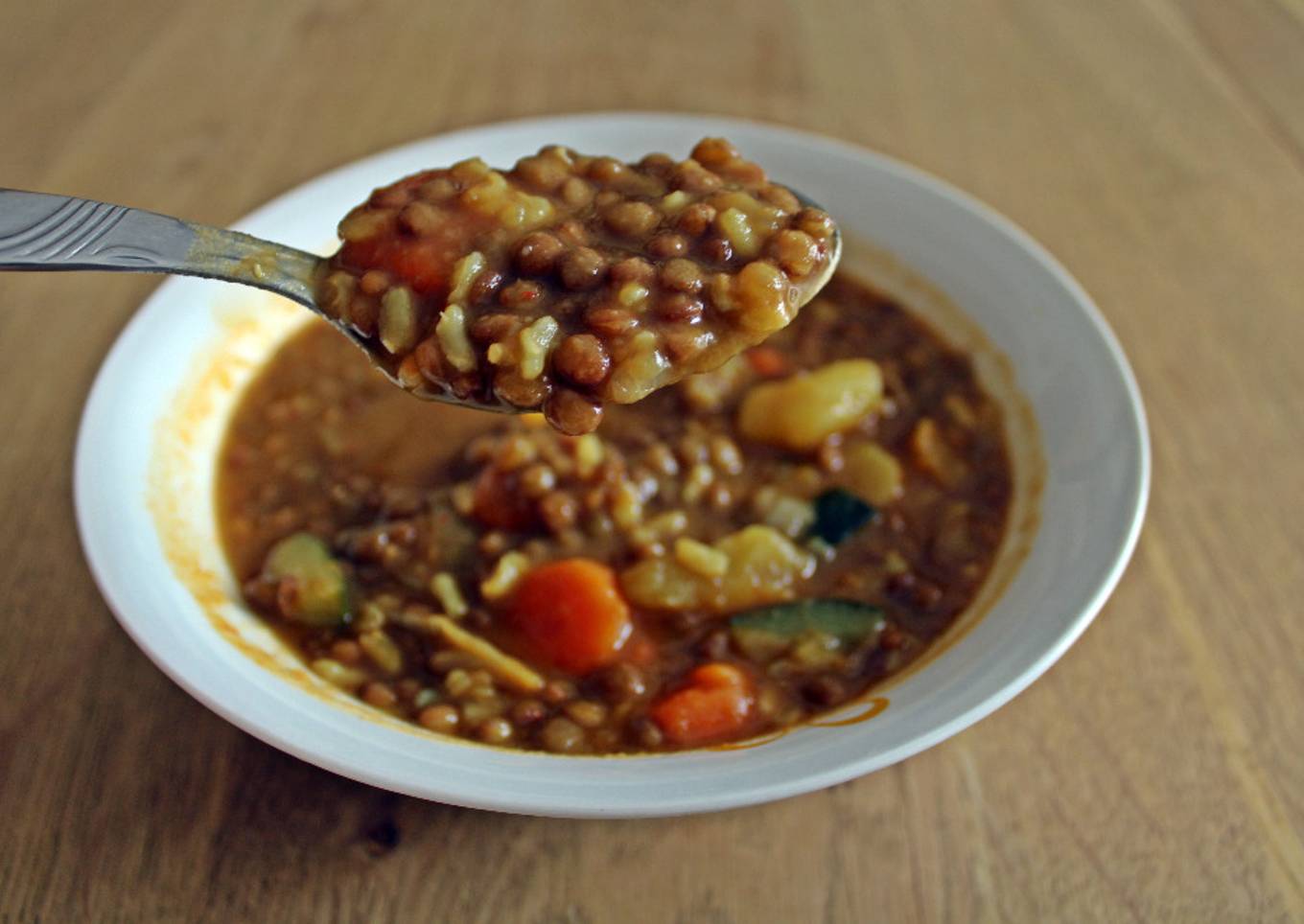 - Una vez esté todo sofritito vamos a agregar las lentejas y el arroz bien enguajados y escurridos, cubrimos con agua y ahora vamos a ir añadiendo la berenjena, el calabacín, las patatas, las zanahorias y la cúrcuma.