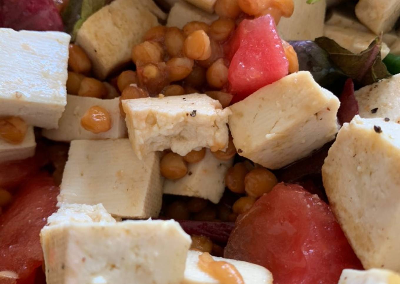 - Poner las lentejas, los brotes y el tomate a dados en un plato hondo.