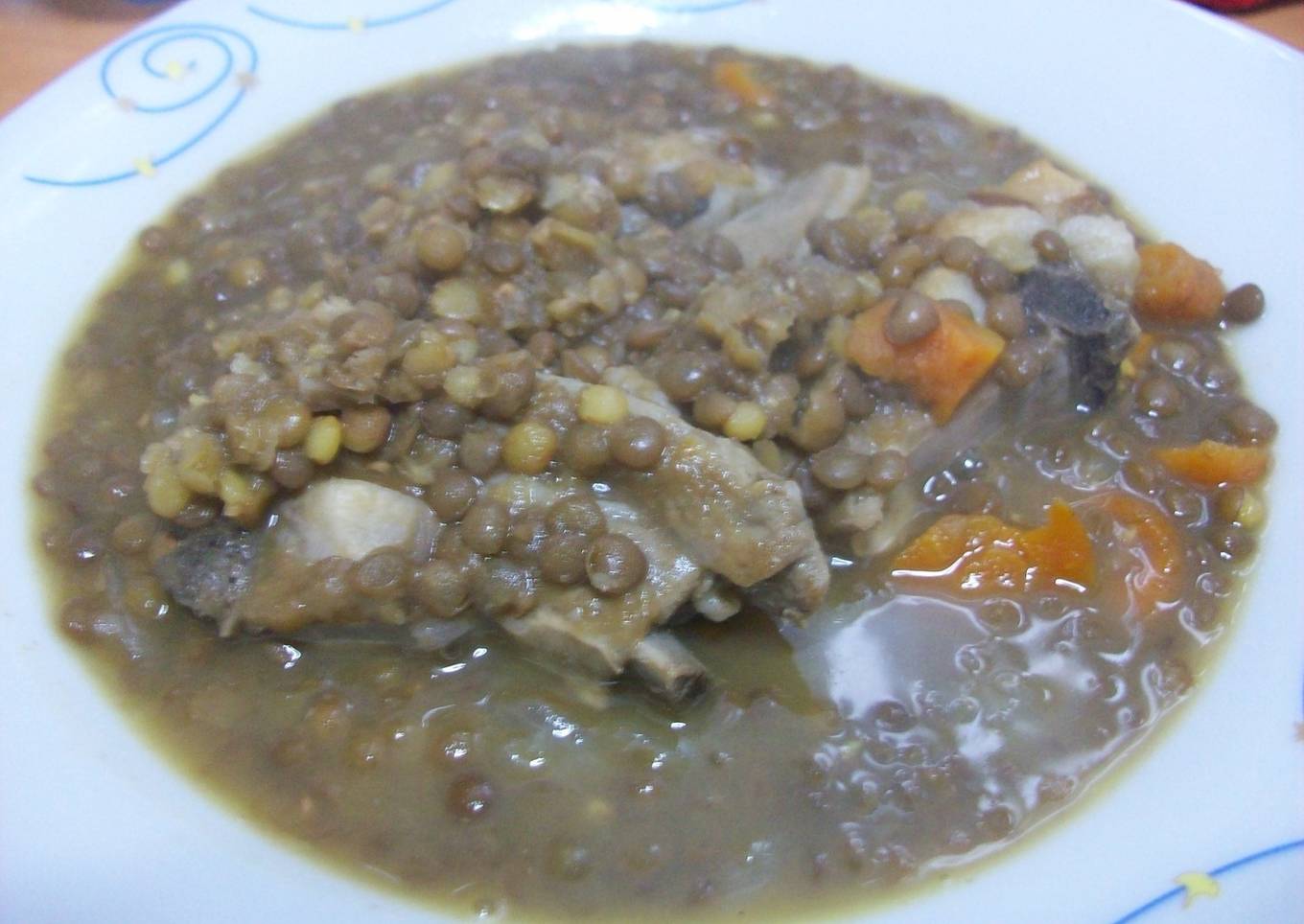 Es una receta de madre. Cazuela de lentejas con cebolla, zanahoria y carne de ternera, todo cortadito bien pequeño.
