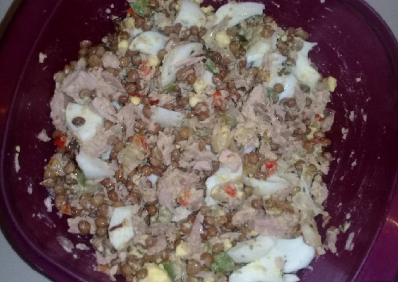 - Una vez que tenemos las lentejas y el atĂșn bien escurridos, le colocamos los huevos picados, y lo que freĂmos.