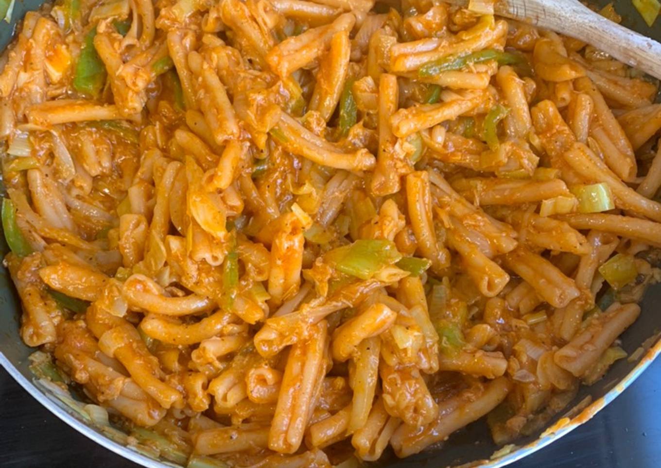 - Una vez que tenemos la pasta reservada.En una sartén grande ponemos un poco de aceite de oliva y cuando empiece a calentarse echamos la verduras con ajo molido y Pimienta negra al gusto. Mezclamos hasta que las verduras estén pochadas y el pimiento blando.