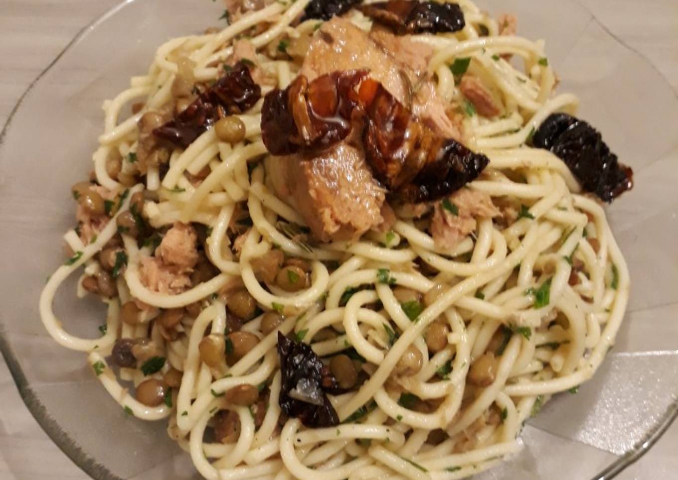 Ensalada de fideos con lentejas atún y tomates deshidratados