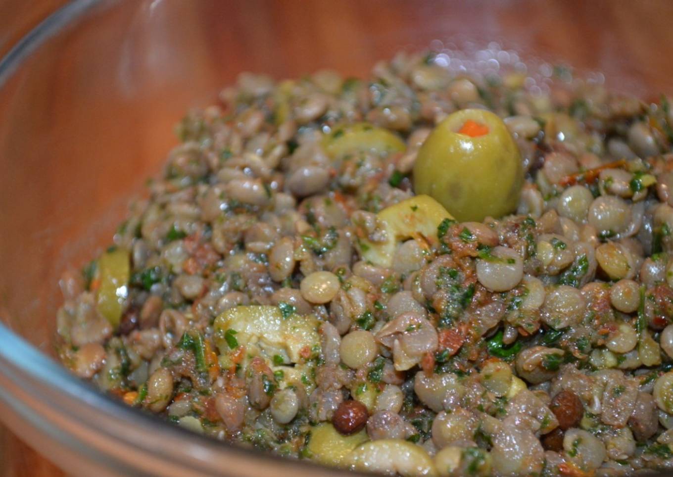 - Ponemos la mitad del aderezo en un bol, agregamos las lenteja, (si usamos tomates frescos aquí los agregamos cortados en cubos pequeños) por último el resto del aderezo y las aceitunas cortadas en rodajas, mezclamos suavemente con un tenedor.