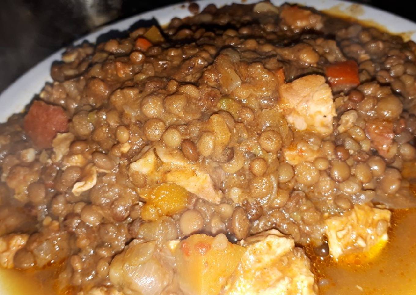 - Vamos A Cortar Las Pechugas En Cubos. Pelamos El Tomate, La Cebolla, La Zanahoria Y El Zapallo Y Cortamos Todo En Cubos Menos La Cebolla Que Será Cortada En Partes Pequeñas. Al Ají Lo Limpiamos Bien Y Cortamos En Tiras Y Luego En Pequeños Trozos.Al Chorizo Colorado Lo Cortamos En Ruedas Medianas Y Al Medio 4 Veces. A La Panceta La Desgrasadamos Y Cortamos En Cubos Chicos. Todo Es Agregado A Una Cacerola A Fuego Lento Junto C Las Lentejas Y El Tomate. Revolvemos Y Condimentamos.