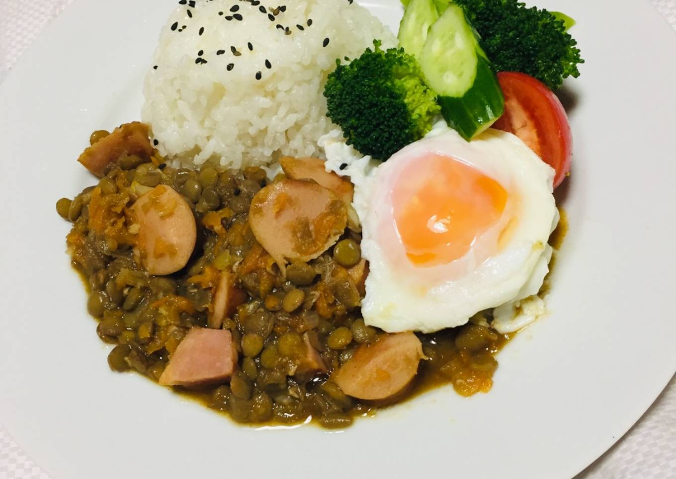 Lentejas con Salchichas, Tocino, vegetales y Huevo Frito, Ensalada!馃嵔馃馃馃憣