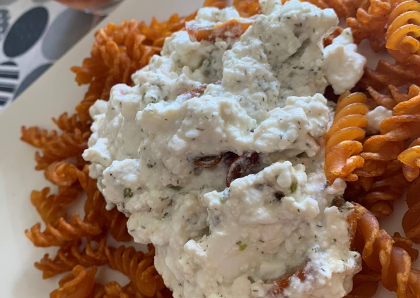 Servir la pasta caliente con el dip.