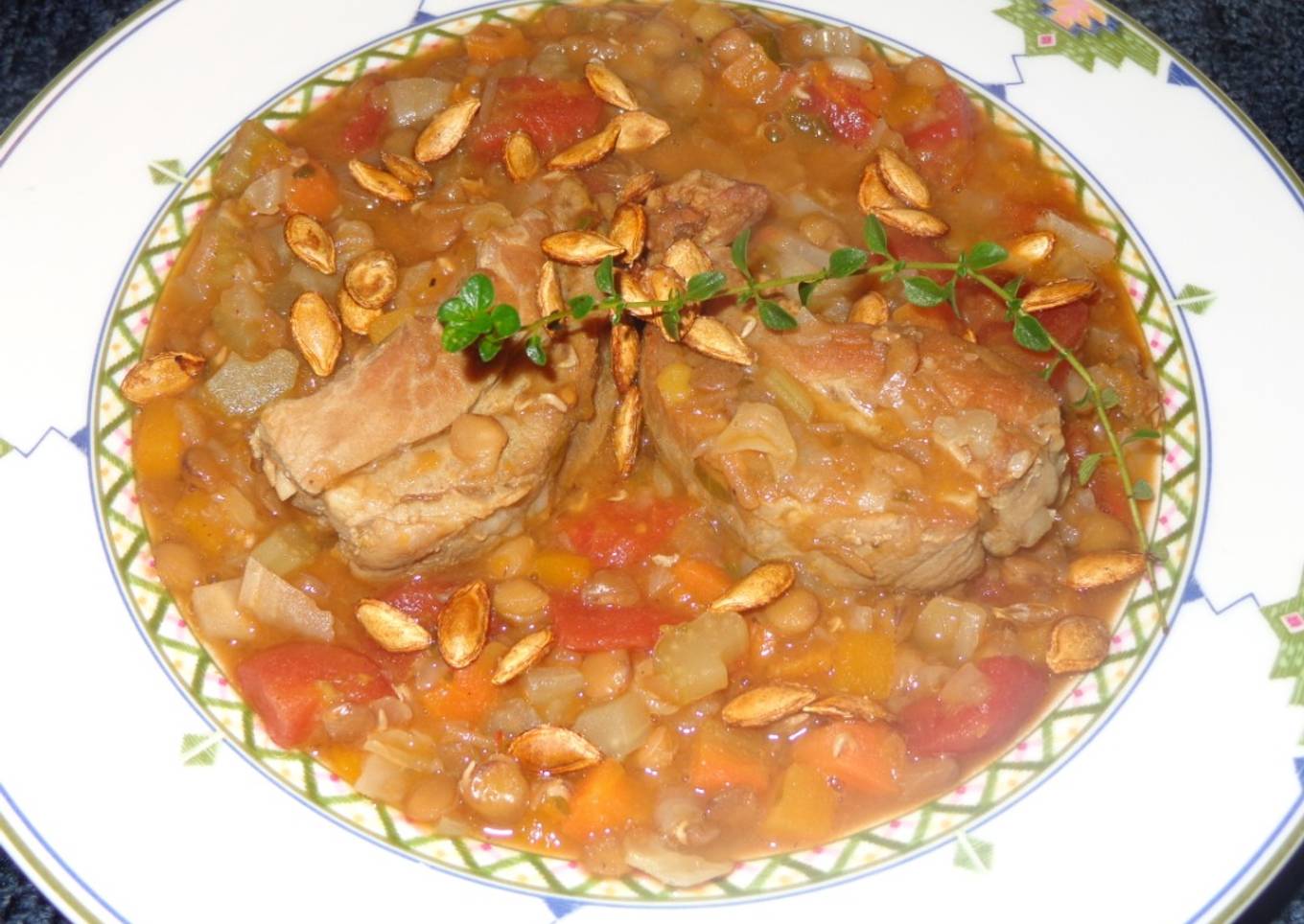 SOPA DE LENTEJAS CON REPOLLO, COSTILLAS Y SEMILLAS DE ZAPALLO ASADAS. JON STYLE