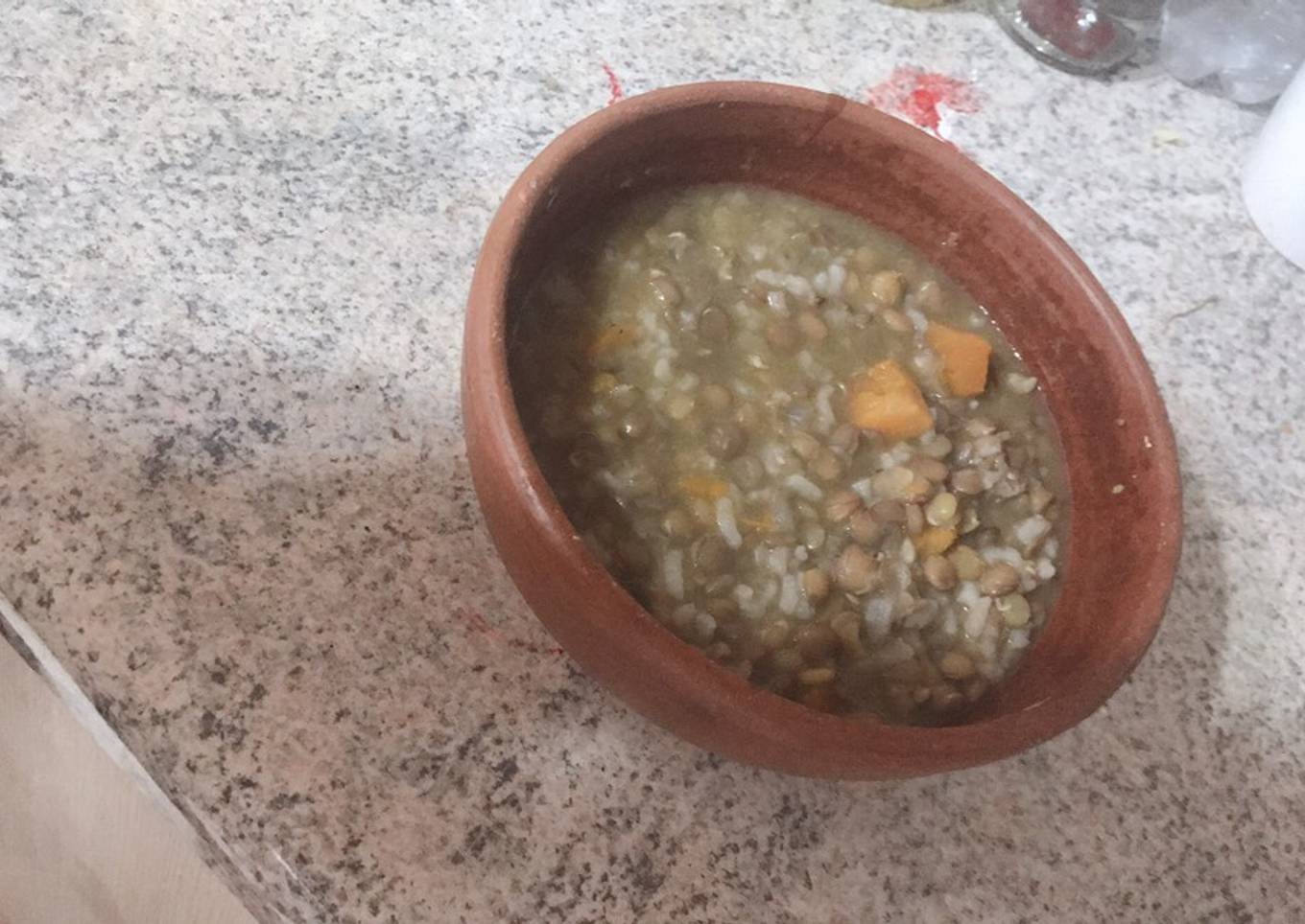 - Se llena la olla con un litro de agua, se vierten las lentejas, el zapallo y las tres cucharadas de arroz.