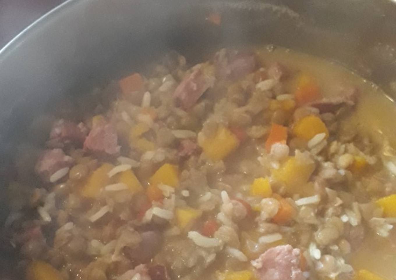- Listo el sofrito se le echan las lentejas ya remojadas durante toda la noche anterior y se le agrega 4 tazas de agua caliente, se le agrega sal y pimienta al gusto y dejar calentando en una olla