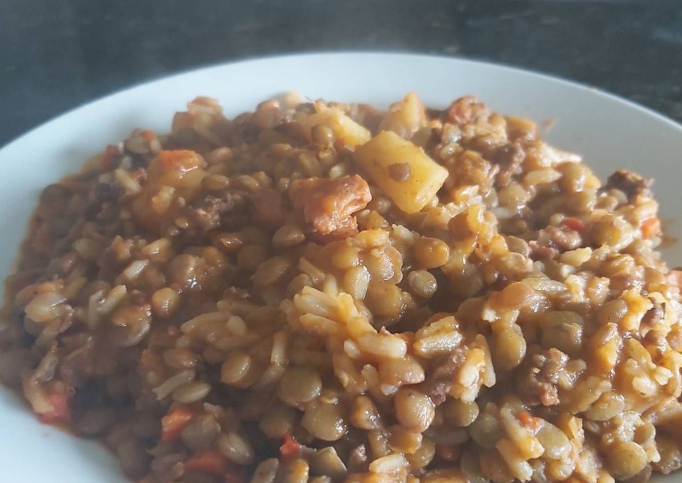 - Luego le vamos poniendo agua si es hervida mejor ya que apura su cocción. (La cantidad de agua es a opción ya que si gusta que quede más caldito se le agregará un poco más)Cuando la papá y la lenteja estén masomenos blanda ahà le incorporamos el arroz, revolvemos dejamos unos 3 minutos aprox revolvemos nuevamente tapamos y dejamos un ratito asÃ, luego servir! Y pronto para disfrutar.