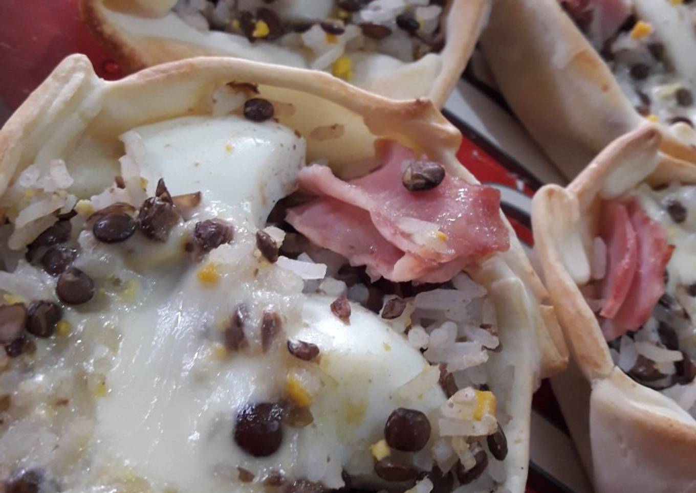 - Prender el horno en mínimo, yo tenía arroz y lentejas hervidas del día anterior masomenos medio kilo los uni y le agregue paleta picada y queso fresco en cubos herví tres huevos y también los agregue mezcle todo (no le puse sal porque me olvide pero se le puede poner 1 cucharadita tamaño café y lo mismo de pimienta) mezcle todo y lo puse en las tapas y fui apretando a los costados hasta formar la canastitas y lo llevé al horno (yo tengo eléctrico en máximo en modo de arriba y abajo)por