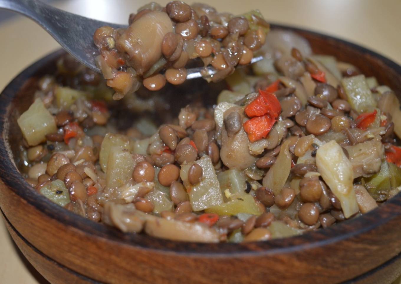 - Agregamos la lenteja y el medio vaso de agua de cocción, mezclamos bien y cocinamos unos 5 minutos más.