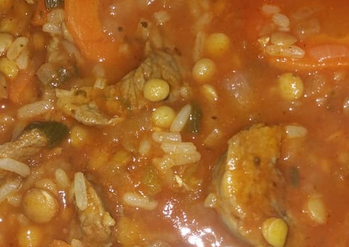 - Después de que haya hervido un rato, agregamos las lentejas (ya remojadas y hervidas, a no ser que usen esas lentejas de cocción rápida) y dos puñados de arroz.