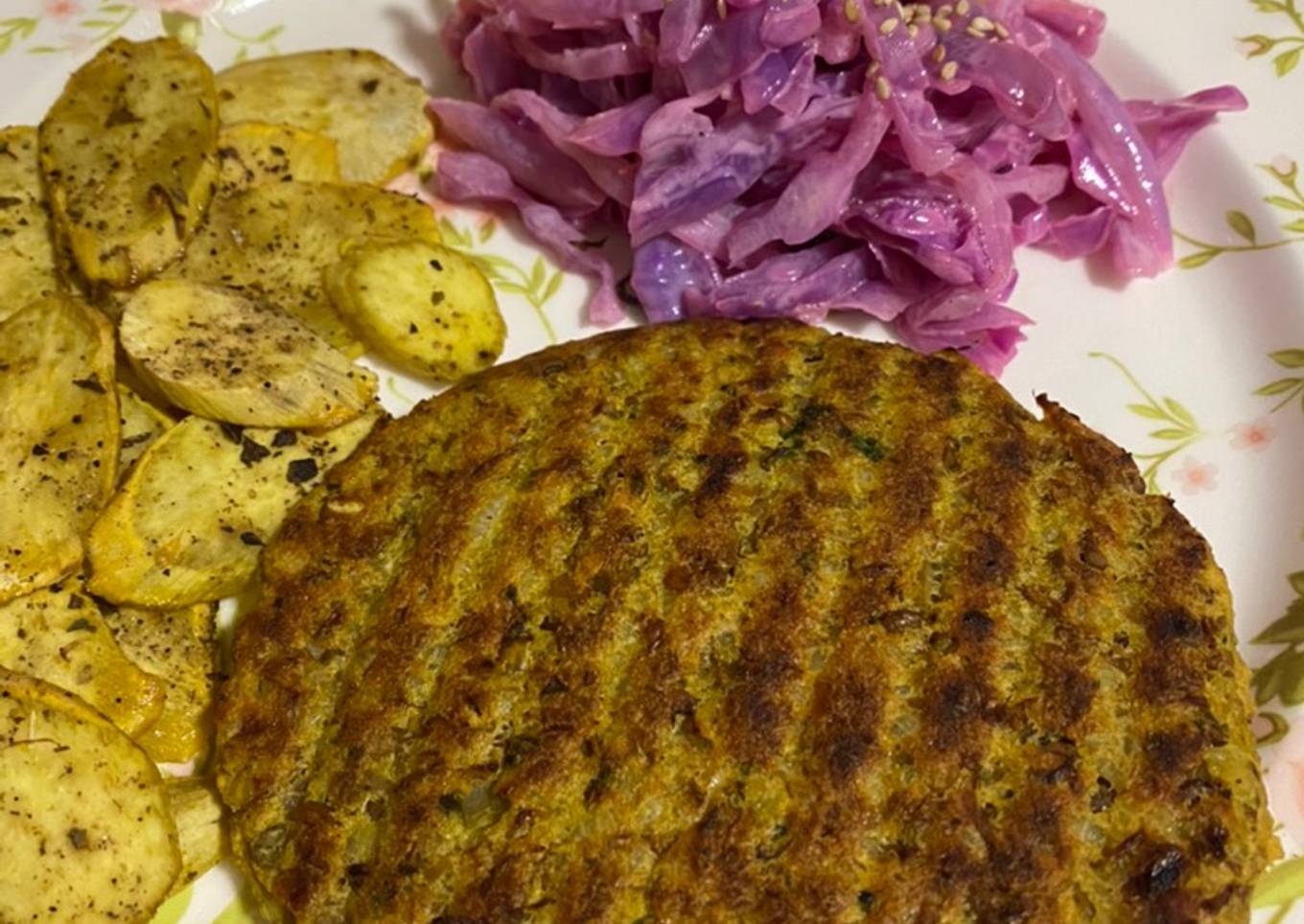 - Cocinarlas en sartén con spray vegetal o muy poquito aceite, o al horno. Yo las acompañé con una ensalada de repollo colorado y pasas y una batatita al horno 😋
