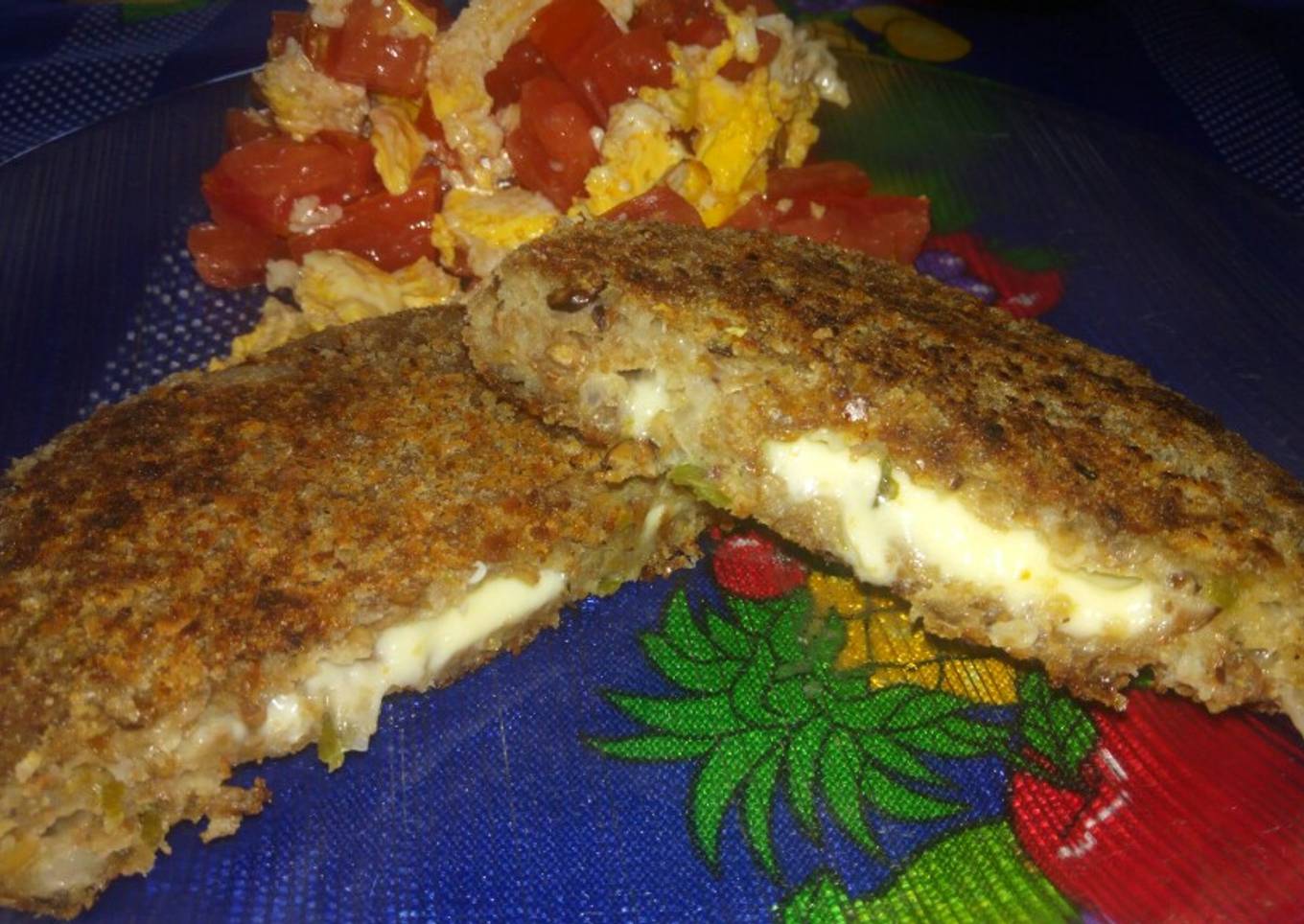 - Dar forma de medallón fino colocar un trozo de queso cremoso y cubrir con otro medallón del mismo tamaño